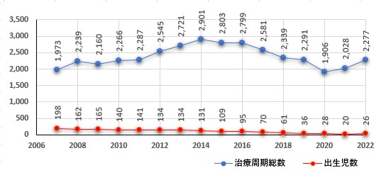 | 治療結果2023年 | 治療周期総数 2257 妊娠数47 流産数8 異所性妊娠数1 出生児数38 | 患者総数396名 AID周期総数1,686回 妊娠数90 流産数11 異所性妊娠(子宮外妊娠)数0 出生児数72 |