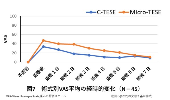 | 術後の痛み | Conventional TESEはMicro-TESEよりやや痛みが少ないです。 手術後7日目には痛みの強さは10のうち1に下がります。 ![]() | |